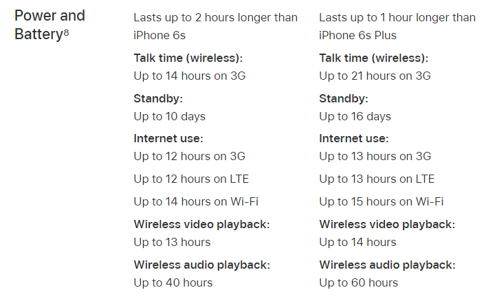 Untuk sektor baterai, iPhone 7 di lengkapi dengan baterai non-removeable dengan jenis baterai Li-Ion berkapasitas 1960 mAh dan iPhone 7 Plus menggunakan baterai dengan tipe dan jenis yang sama tetapi memiliki kapasitas sebesar 2900 mAh. Untuk lebih jelas silahkan teman-teman lihat tabel estimasi penggunaan daya di bawah ini :